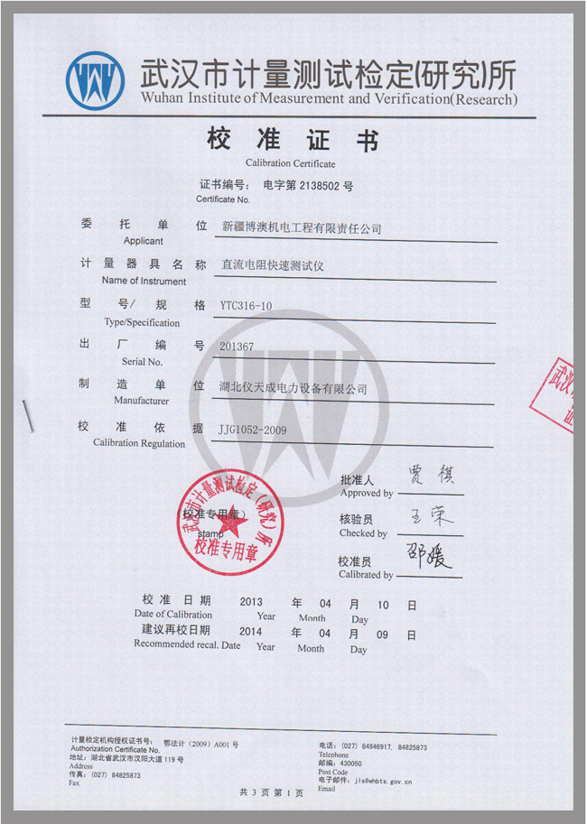 YTC316-10直流電阻測(cè)試儀鑒定證書(shū)